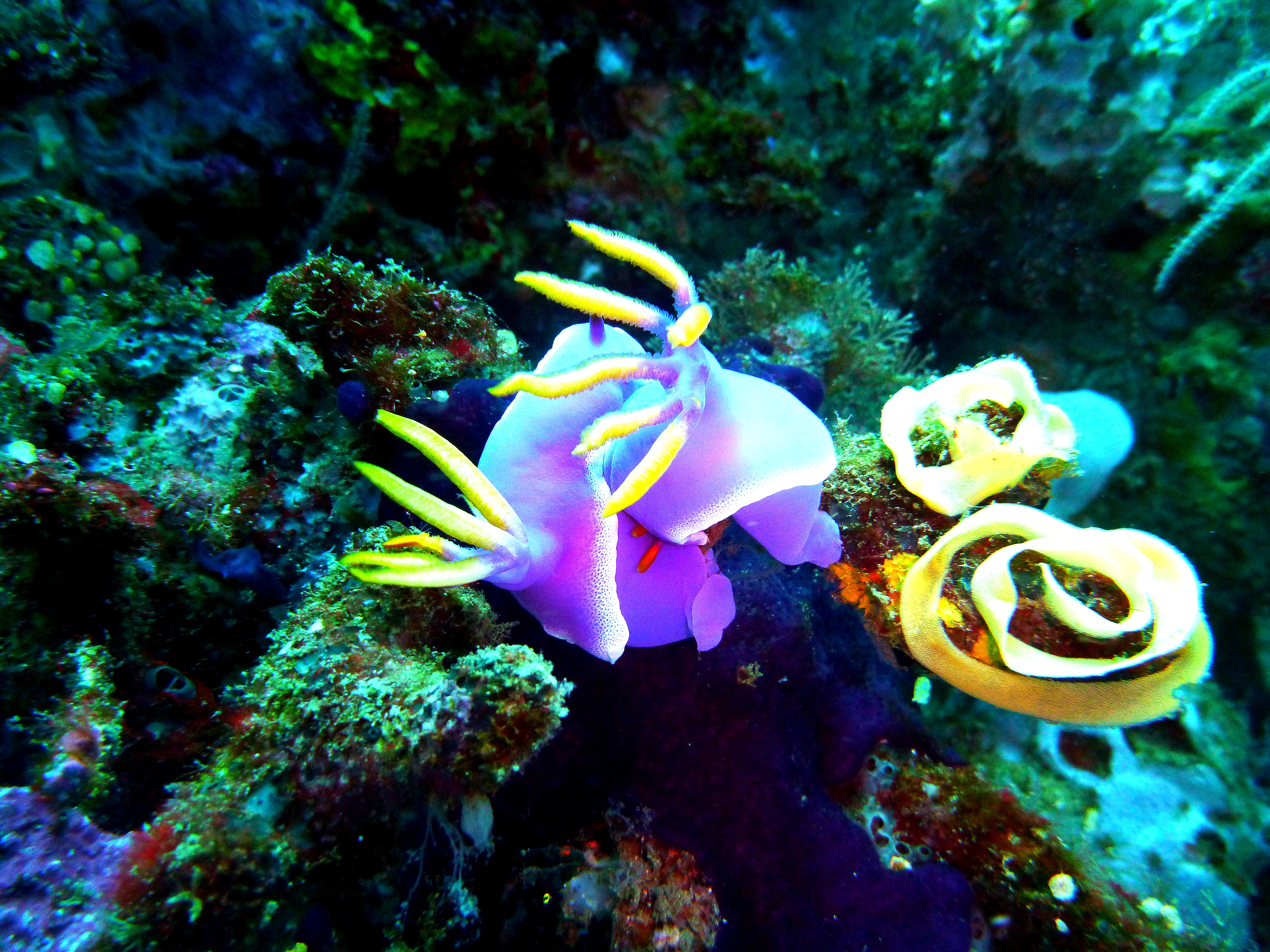 It’s one of those sea slug that catches one’s attention due to its striking appearance. The background color is a rich pinkish purple with a white border to the mantle. At the edge of the mantle the border is solid white but inside this is a region of varying width in which the white forms a reticulate pattern gradually merging in to the pinkish purple. The rhinophore stalks and the base of the gills is an intense purple, the rhinophore clubs and the gills are orange yellow.