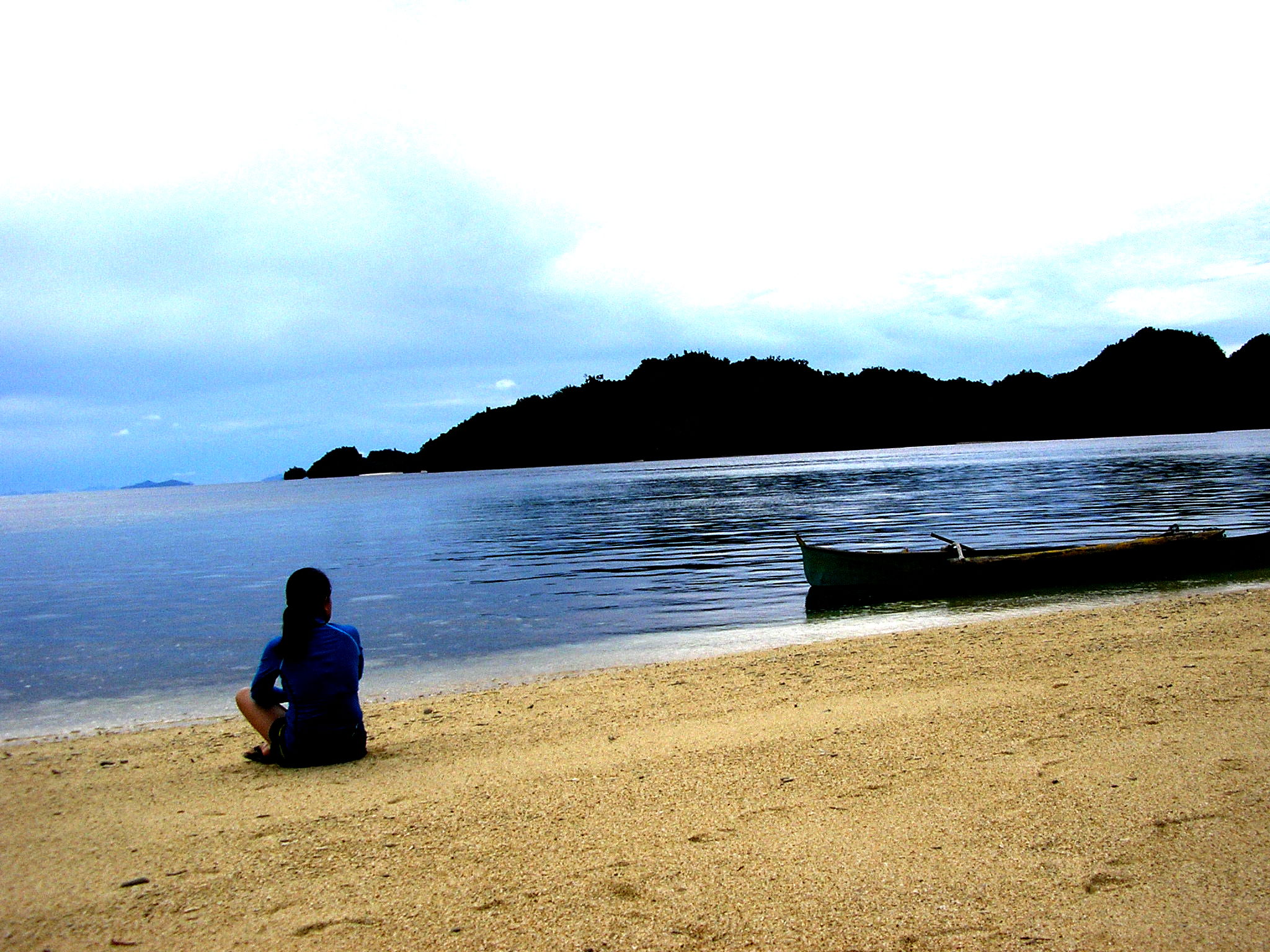 Not wanting to waste time, we rushed off with our guide Reggie to Marka A Island, a rock mountain islet in green vegetation surrounded with blue waters with small patch of beach. Angel and I wanted to freshen our gills as it’s been four weeks since our last dive. From our yellow small boat, we jumped off to the waters to swim and snorkel, indeed we were not disappointed. The sandy slope was decorated with variety of corals – most are table corals in different colors and sizes punctuated with variety of fish species. Trumpet fishes, Moorish idol, damsels, anemone fishes, pipefish. Sweetlips, fusiliers and lot more. A bluish boxfish wiggling its way from us, he hid away down the corals as it noticed us following him. We drifted with the late afternoon current as we watched the scenery below us, as we swam shallower we caught glimpse of striped fish in herd camouflaging as one big fish, then a pair of trumpets attacked them and they scattered but grouped back again, the poor herd was bullied at least twice. We swam to the small white beach as the waters getting colder joining other people there. We lingered for some time in the shallow waters with the orange horizon beyond as the day’s sun ebbed down.