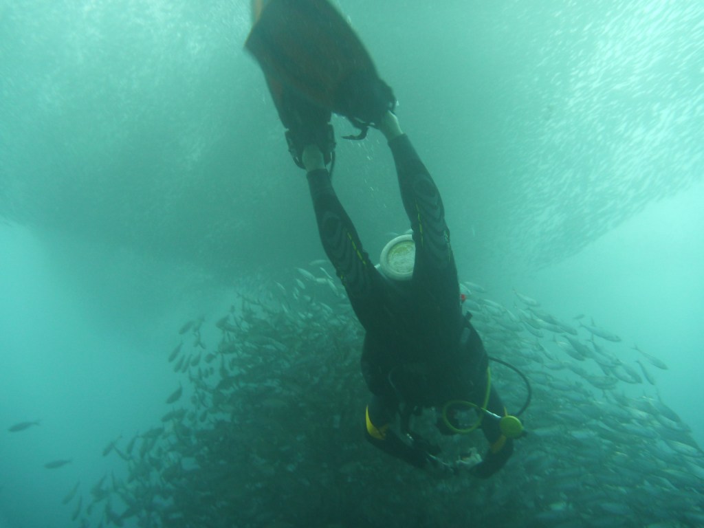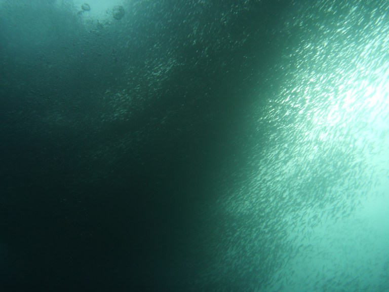 I kept looking up until in an instant a dark patch clouded over us, the sardines shoal was upon our very eyes! Like a magic but for me, it’s purely mystical. I know I will never get tired watching again and again such incredible marine sight. 🙂 How majestic are His creation!