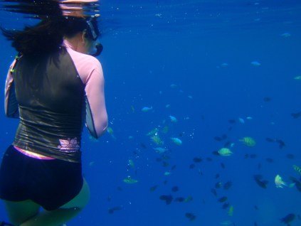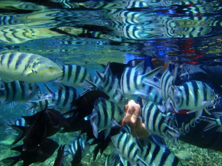 We hop next to Shimizu Island (named after two Japanese brothers who died while diving due to air loss), there’s a white beach again but what was most interesting was the active fish life in the area. We snorkeled and even without food, throng of sergeants, six bar wrasse and damsels gather around on you, it was simply marvelous!
